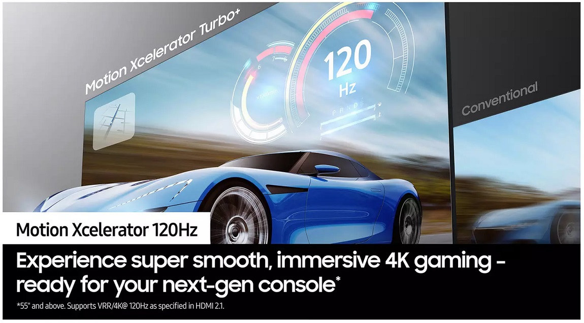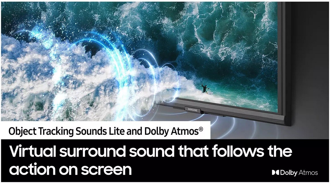 For a truly immersive viewing experience, you need great sound. This Samsung TV has Dolby Atmos, Object Tracking Sound Lite, and Adaptive Sound Pro technology, and if you add a Samsung Q-Symphony sound bar (sold separately) both the TV and sound bar speakers play together in perfect harmony.